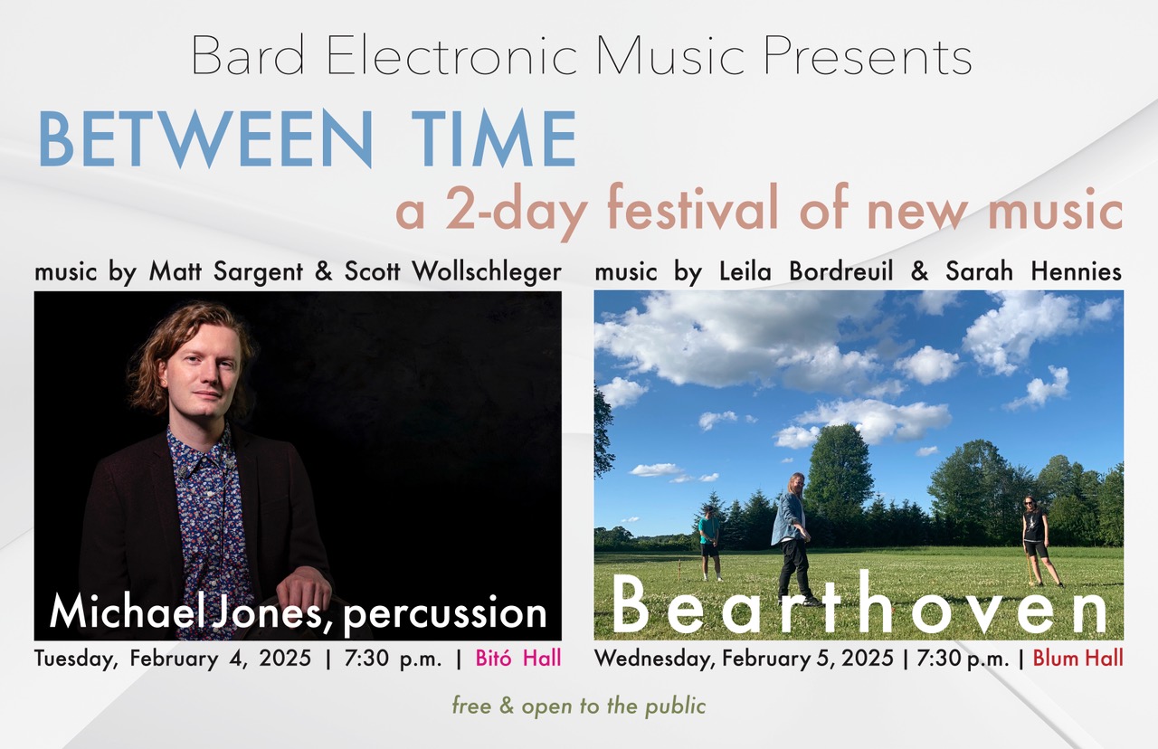 Tuesday, 2/4: Visiting artist Michael Jones (percussion and electronics) Wednesday, 2/5: Visiting ensemble, Bearthoven Tuesday, 2/4 - Bito CPS, Wednesday, 2/5 - Blum Hall7:30 pm – 9:30 pm EST/GMT-5 On Tuesday, February 4, Michael Jones (UC San Diego) performs new music on percussion and electronics by Bard professor Matt Sargent and composer Scott Wollschleger. 7:30 PM in Bito CPS.
