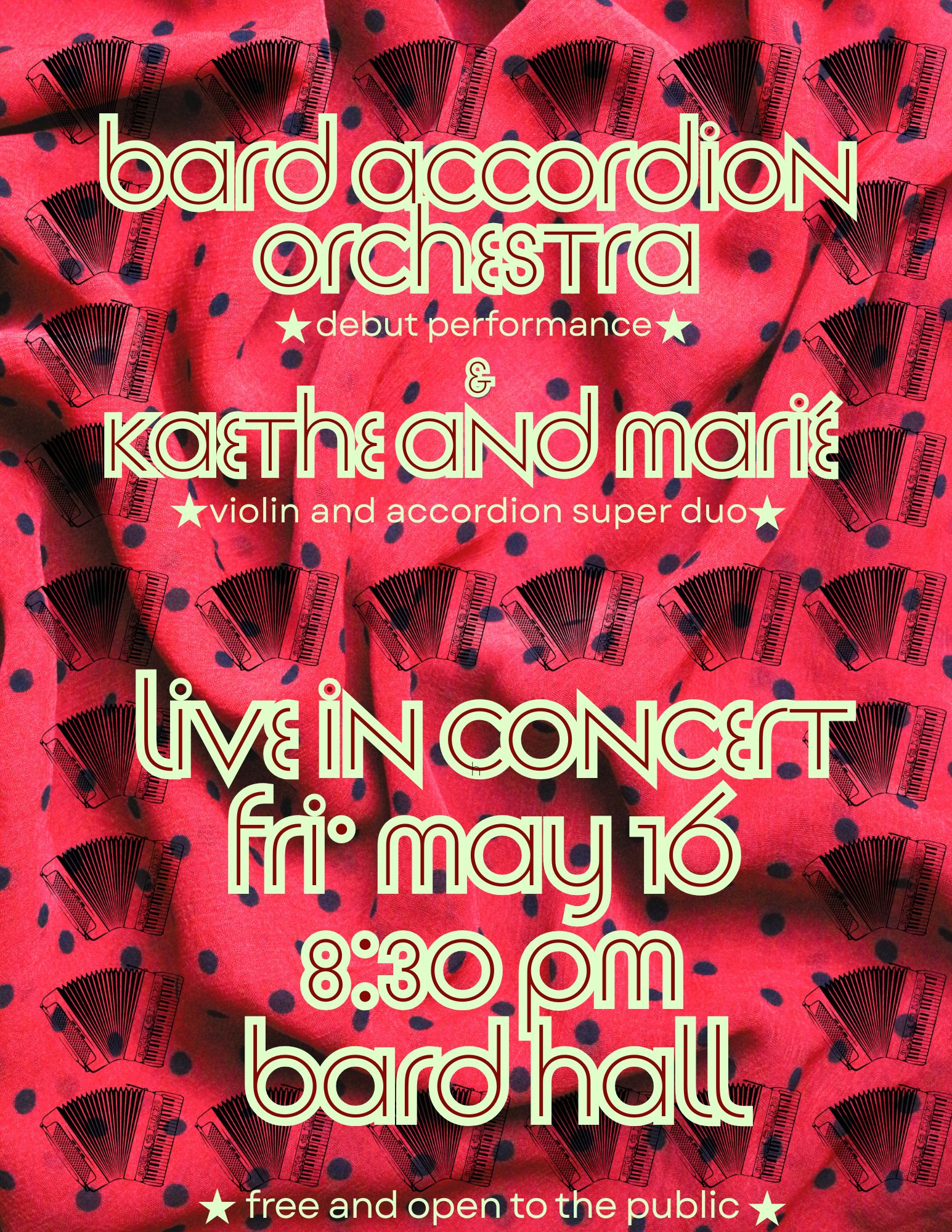 And Kaethe & Marié , the violin & accordion super-duo Bard Hall8:30 pm – 10:00 pm EDT/GMT-4 Please join us at Bard Hall on May 16th, 8:30 PM for the debut performance of the Bard Accordion Orchestra featuring the students enrolled in Prof. Sonevytsky’s Accordionology class, and special guest singer Eva Salina. This will be followed super duo Marié Abe and Kaethe Hostetter, who will play accordion and violin arrangements of tunes from Ethiopia, Japan, the US and more. This event is free and open to the public.