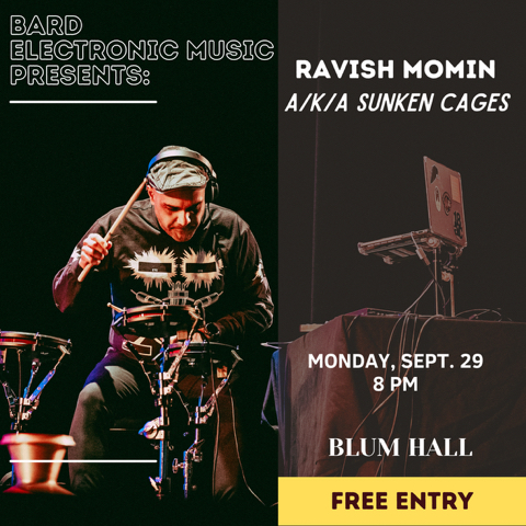 Blum Hall8:00 pm – 9:30 pm EDT/GMT-4 Bard Electronic Music is pleased to welcome Indian-born drummer, electronic music producer and educator Ravish Momin, aka Sunken Cages, for a free concert. His music is made by combining acoustic and electronic drum sounds which are enhanced by live triggering of sounds and textures, layering of loops, and manipulating them improvisationally in performance. While rooted in Indian folk and Black music traditions, Sunken Cages is also influenced by the street sounds of South African G’com, Angolan Kuduro, and Egyptian Mahraganat. For more information see www.ravishmomin.com or contact Professor Sarah Hennies at [email protected].